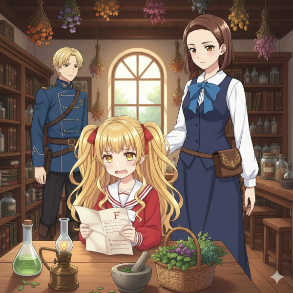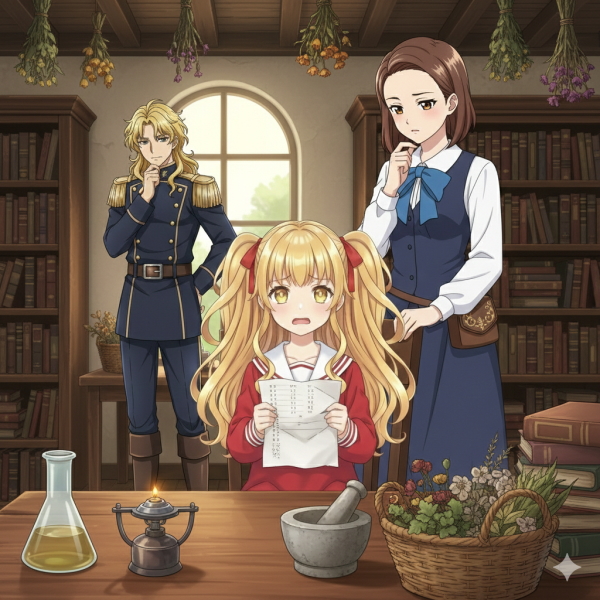「アニメスタイルの画像を作ります。赤い服の少女がテーブルの前に座り,テストの答案用紙のような紙を両手で持っています。少女は唇を半開きにして眉を下げ,悲しんでいる様子です。少女の脇に紺色の服の女性が立ち,少女の座る椅子の背もたれに手をついています。紺色の服の女性は少女の持つ紙を見下ろし,心配そうな表情をしています。少女と女性の背後,少し離れた場所に窓があり,窓のそばに軍服姿の青年が立っています。青年は左手を顎に当て,右手を腰に当て,俯いています。何か悩んでいる雰囲気です。テーブルにはフラスコ,アルコールランプ,乳鉢,ハーブの入ったカゴがあります。室内には本棚があり,天井からドライフラワーが吊るされています。」