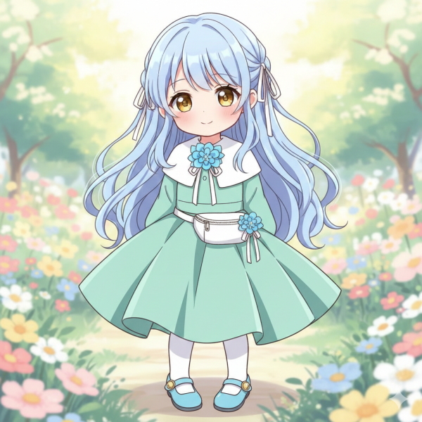 「アニメスタイルで画像を作成します。5歳くらいの可愛い女の子です。あどけない顔立ちで,目の大きさが目立ちます。髪は淡い空色で,目は金色です。髪型は側頭部だけを少し結んだ,長いウェーブヘアです。結び目に白くて細いリボンを結んでいます。服はミントグリーンの膝丈ワンピースで,ウェストからスカートが広がっているデザインです。襟は白のショールカラーです。襟の合わせの部分に,空色の小花の造花をつけています。造花の裏側から垂れているリボンも,白くて細いものです。ワンピースの下には白いタイツを履いていて,靴は空色です。バンドのある可愛い靴で,留め金は金色のボタンです。腰に白いウェストバッグをつけています。ウェストバッグはファスナータイプのものです。バッグの表に,襟元についている造花と同じデザインの飾りがついています。女の子はにかんだ笑顔で,唇を閉じて少しだけ微笑んでいます。」