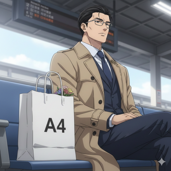 「体格の良い黒髪の青年のアニメキャラが,微笑みながら駅のベンチに座っています。黒髪をオールバックにしています。銀縁の眼鏡をかけています。服装は紺色のスーツにベージュのトレンチコートです。膝の上にペーパーバッグがあり,バッグの口から小さな花束がのぞいています。青年の左脇には黒のビジネスバッグが置いてあります。駅構内から見える空は夕暮れです。時計や発着表示板は不要です。この条件で,青年を左側から見上げる感じの構図にして下さい。」